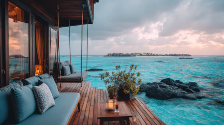 A wooden deck extends toward the ocean, showcasing a relaxed setting. Comfortable seating with blue cushions and a small table are present. The ocean's turquoise water meets the cloudy sky. This image is suited for illustrating vacation, leisure, or travel concepts. It could be used for advertising or editorial purposes.