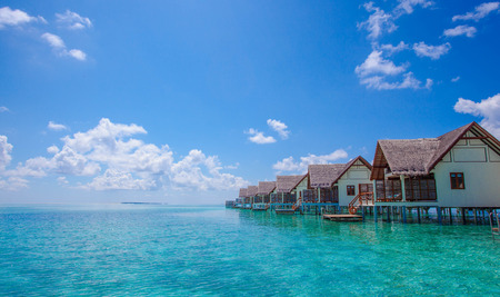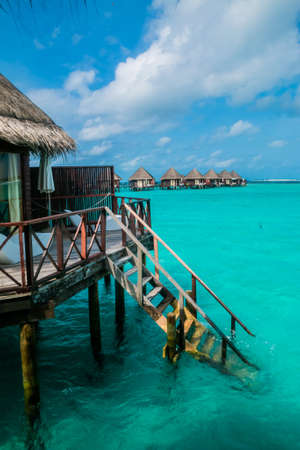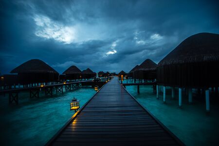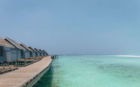 Beautiful view at Maldivas water villas with wooden walkway above the ocean water, connecting bungalows to island