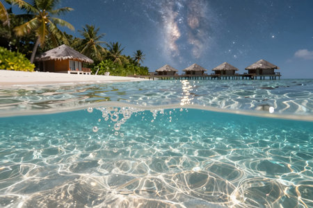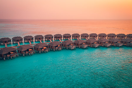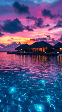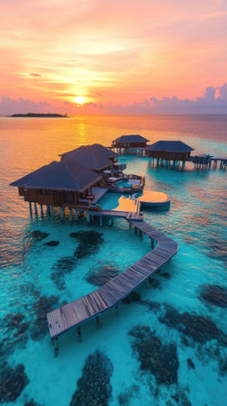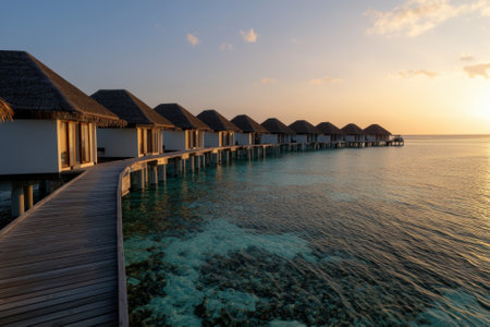 Tranquil sunset illuminating luxury overwater bungalows in crystal-clear turquoise waters of the Maldives