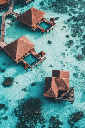 Aerial view of beautifully designed overwater bungalows situated in clear turquoise waters. Coral reefs and a wooden walkway enhance the serene tropical landscape, creating a peaceful escape.