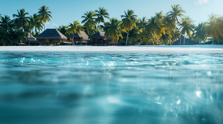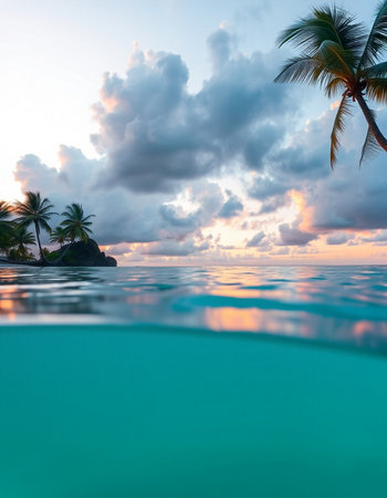 A tranquil tropical island with lush palm trees, surrounded by crystal-clear blue waters, under a serene sky.