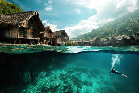 A diver swims beneath clear turquoise water, revealing a traditional village nestled among lush greenery.