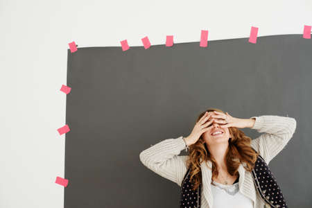 Mid adult woman smiling, hands covering eyes