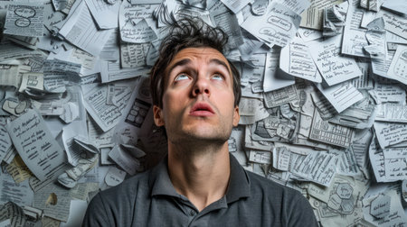 Contemplating Chaos: Man Amidst Pile of Papers