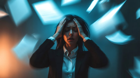 Stressed businesswoman holds her head amidst a chaotic flurry of papers, symbolizing the pressures of multitasking, time management, and meeting tight deadlines in a demanding work environment
