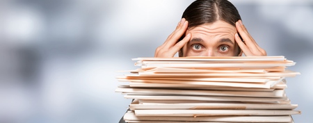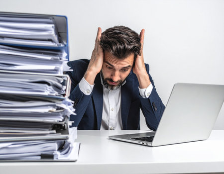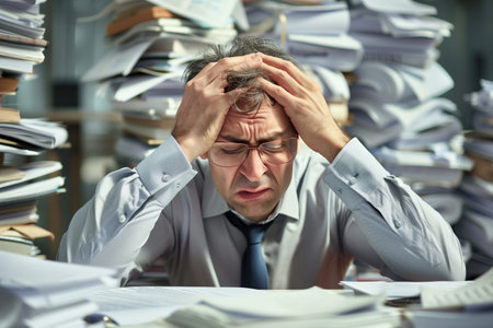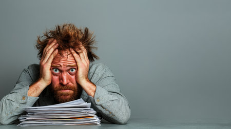 A man with disheveled hair and a pained expression puts his hands on his head in frustration. Piles of paperwork surround him in a simple gray office environment during daylight.