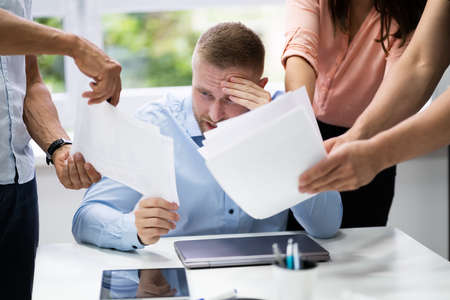 A stressed man surrounded by paperwork, representing overwhelming pressure and chaos in a business environment.