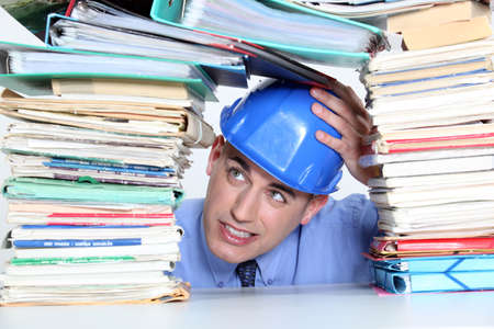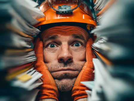 A fatigued laborer clad in protective attire and bright orange gloves appears overwhelmed amid a mountain of documents, embodying stress in a hectic site setting.