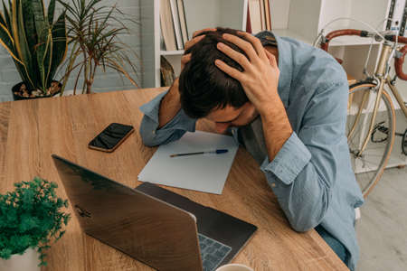 Depressed young businessman holding head in hands, has problem, a laptop on the desk. A guy made a mistake in a work