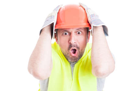 Shocked young builder holding his head looking desperate as work problem concept isolated on white background