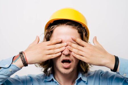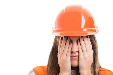 Portrait of scared woman engineer covering eyes with hands on white background with copy space
