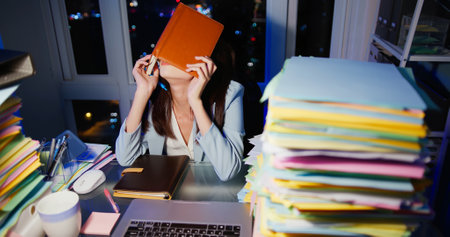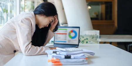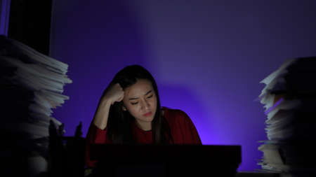 asian young businesswoman is annoyed while working overtime with laptop and documents in office