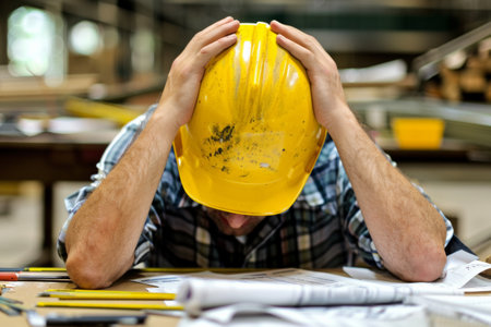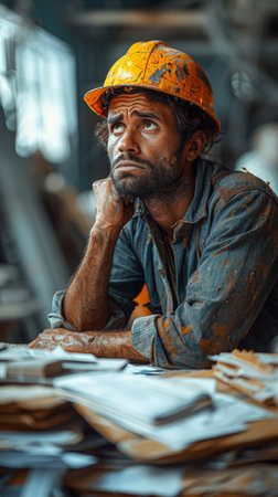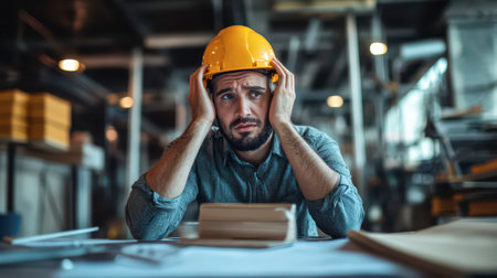 A construction worker wearing a yellow hard hat looks worried while sitting at his workstation surrounded by materials and plans, indicating stress over upcoming project deadlines.