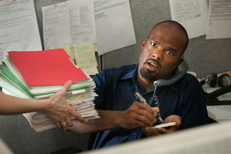 Business man whose desk is full of documents at work , Businessman stressed with stack of paperswork