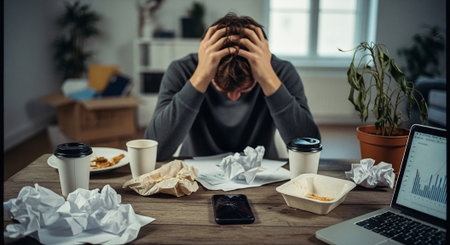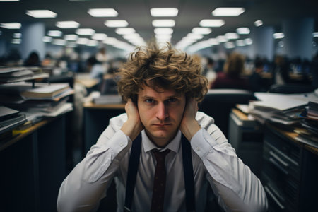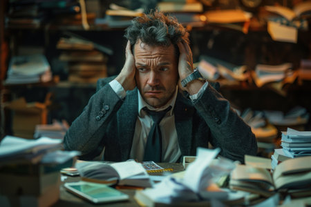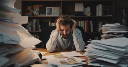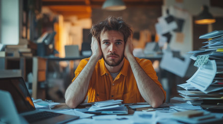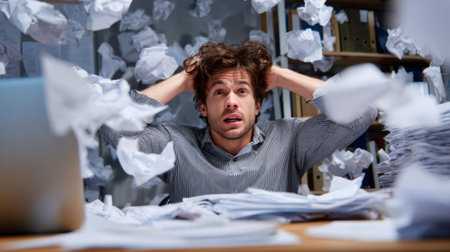 An overwhelmed male office worker sits at a cluttered desk, feeling the stress of deadlines, surrounded by crumpled papers, capturing the chaos of modern work.