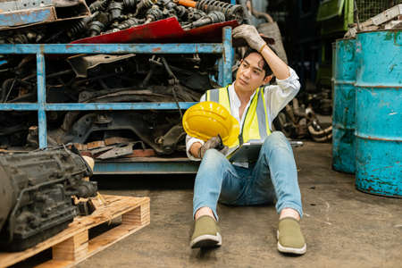 Asian engineering man worker wear uniform holding hardhat sitting tiredness and strain from work. warehouse workplace factory industrial heavy machine.