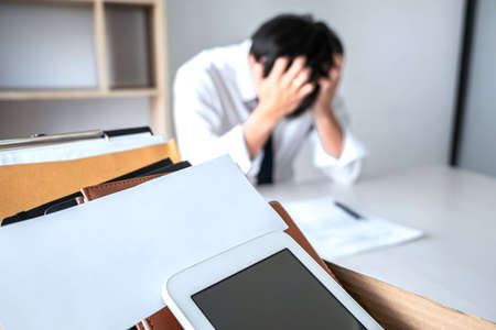 Businessmen to put his hand to the head , stressed because they have to work hard at office desk.
