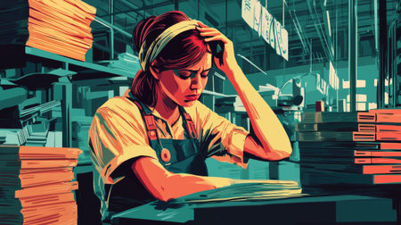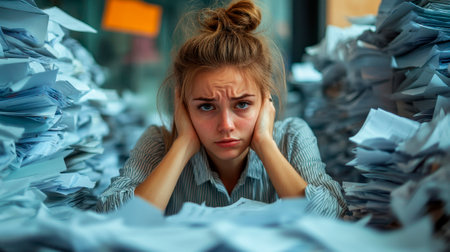 A mountain of paperwork looms over a weary bookkeeper, her face etched with frustration This poignant image captures the overwhelming stress of a demanding accounting role, leaving her feeling overworked and overwhelmed This story explores the signs of job stress in bookkeepers and offers practical coping strategies for navigating the AI Generative
