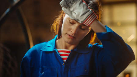 Young Beautiful Empowering Woman Rubs Her Forehead. Authentic Fabricator Wearing Work Clothes in a Metal Workshop. Sparks Flying on the Background.