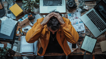 A top view of a stressed man holding his head, surrounded by a cluttered workspace filled with papers, laptops, and other technology, depicting work pressure and frustration.