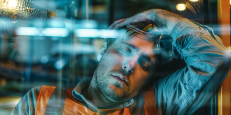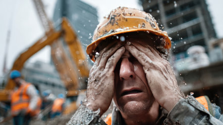 A construction worker shows signs of stress while facing rain on a job site. The image captures the struggle and determination of labor in urban construction environments.