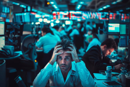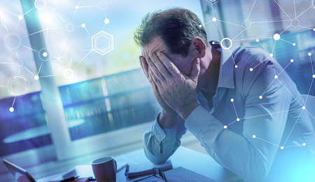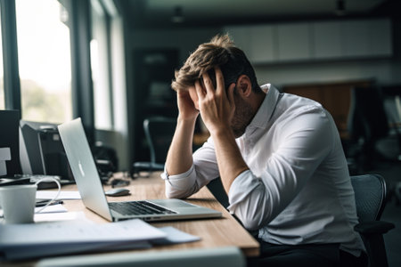A photo capturing the tension and anxiety of a man sitting at a desk with his head in his hands.
