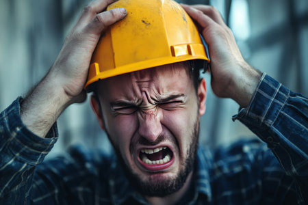 Angry construction worker in helmet facing challenges, stressed and unhappy on the job site.