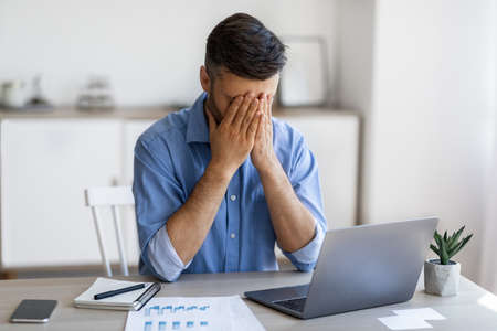 Fatigue From Work. Stressed male entrepreneur covering face with hands at workplace, tired after using laptop, having business problems, overworked businessman feeling unhappy and unwell, free space