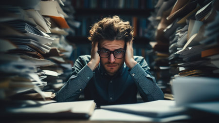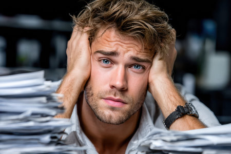 Young man struggles with stress while surrounded by piles of paperwork, feeling overwhelmed at work.