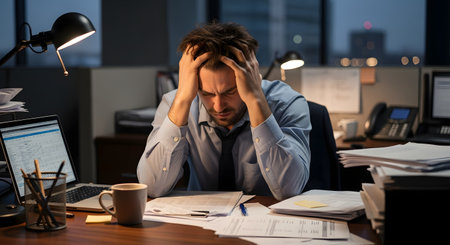 A stressed and overworked businessman sits at his messy desk late at night in a dark office. He has his hands in his hair, looking down at paperwork with a frustrated expression. A laptop, coffee mug, and stacks of documents surround him, illustrating burnout and deadlines.