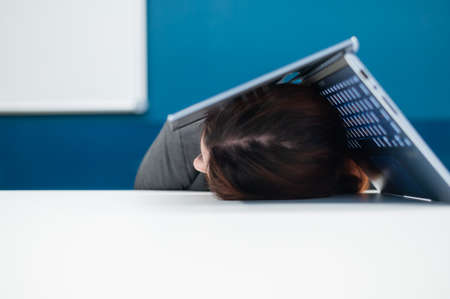 Exhausted business woman covered head with laptop. Tired female worker with a computer above her head.
