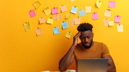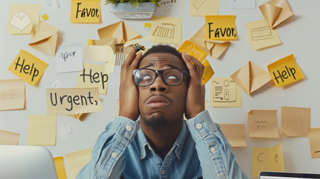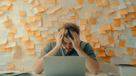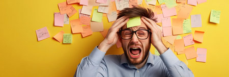 Stressed office worker surrounded by colorful sticky notes, symbolizing multitasking and deadline pressure. Hands on head, expressing frustration and time management challenges