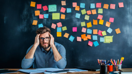 Stressed worker sits at a cluttered desk, surrounded by colorful sticky notes on a chalkboard, symbolizing multitasking and time management challenges in a chaotic work environment