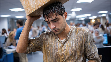 This captivating image depicts an overwhelmed employee in an office drenched in water, symbolizing the stress and chaos of modern workplace dynamics.
