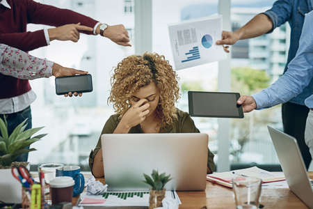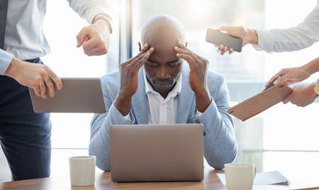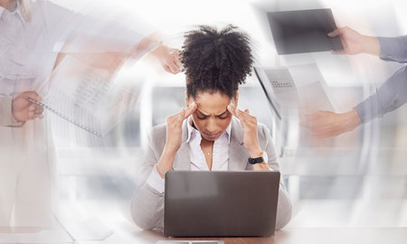 Stressed, depressed and frustrated black entrepreneur with overworked, suffer from burnout, anxiety and headache. Business woman struggle with work overload chaos, fail to meet deadlines.