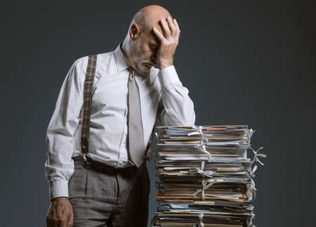 Pensive worried businessman leaning on a pile of paperwork, bureaucracy and administration concept