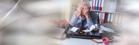 Overworked businessman sitting at a messy desk in office, light effect; panoramic banner