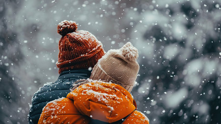 Back view of young couple in warm clothing walking in winter forest under snowfall embracing