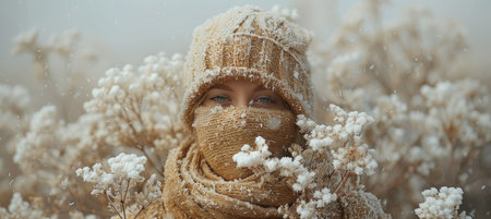 A captivating winter portrait featuring a model wrapped in warm clothing, surrounded by frosty flowers. The serene atmosphere evokes tranquility and beauty in the cold.