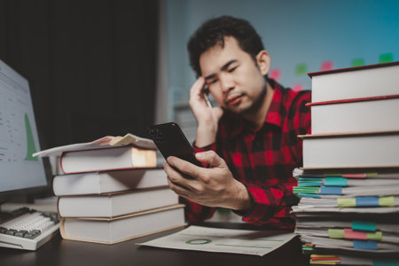 Young Asian businessman tired and stressed in office. Generative AI