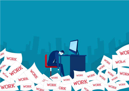 Stressed and exhausted office worker with pile of document on desk without comeliness