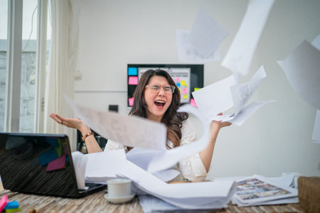 asian young businesswoman is annoyed while working overtime with laptop and documents in office