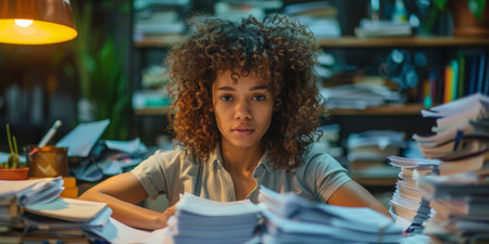 A young professional woman is sitting at a desk surrounded by stacks of papers. She appears focused and busy, possibly working on a project or organizing documents.