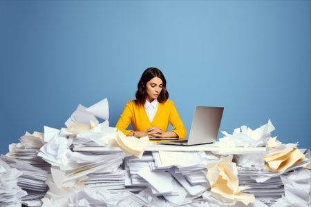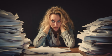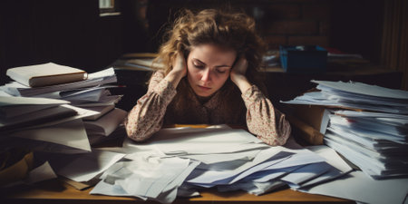 A frustrated woman overwhelmed by stacks of paperwork, representing the challenges of office work and paperwork management.