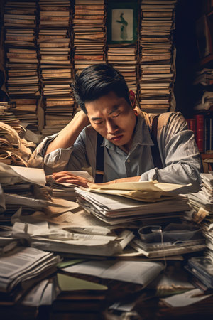 Young man struggles with stress while surrounded by piles of paperwork, feeling overwhelmed at work.