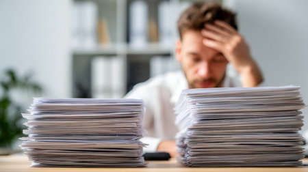 Stressed businessman with head in hand is surrounded by tall stacks of documents on a desk in a modern office setting with blurred background