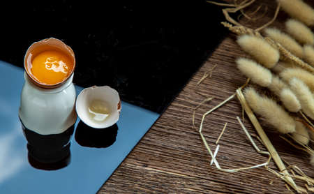 Broken chicken egg and Dried flowers on table. Copy space, Selective focus.