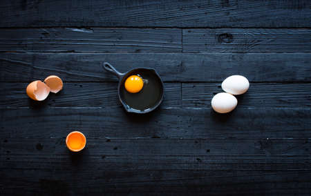 Chicken egg on a dark wooden background, free space for text. Top view