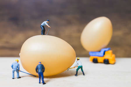 Miniature people work at Easter-eggs for Easter day