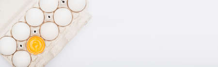 top view of fresh chicken eggs and yolk in cardboard box isolated on white, panoramic shot